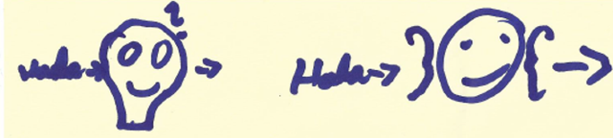 "Wie ist es jetzt für dich, wenn dich die Mädchen auslachen?" "Sie lachen, ich bin ganz blau! Es geht durch ein Ohr rein und das andere raus." Zeichne, bitte, den Unterschied zu vorher auf. Blitzschnell entsteht eine kleine Zeichnung mit Ohren.