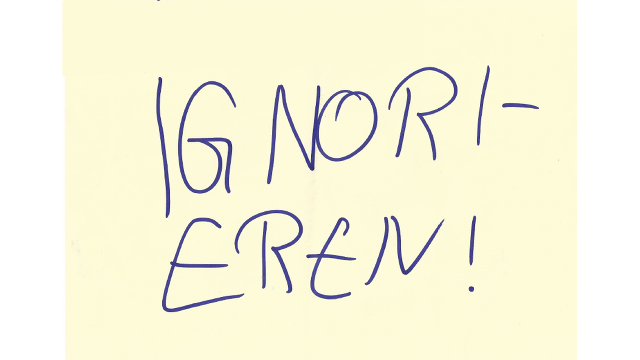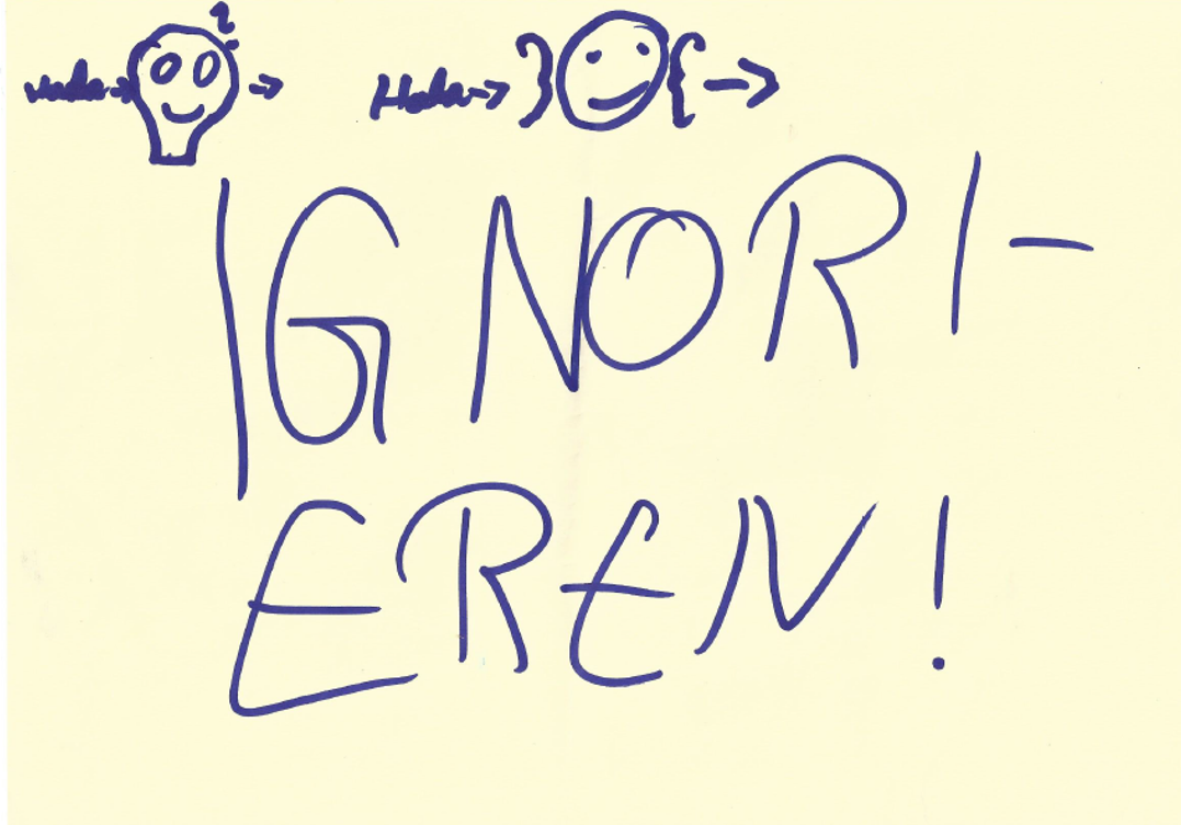 „Daniel, welche Farbe passt am besten zum Ignorieren?“ Daniel taucht in seine Innenwelt, um „Ignorieren“ zu finden und um Farben vergleichend sagen zu können, welche Farbe dazu passt. Er schließt kurz die Augen und sagt: “ Blau“. Ich schiebe ihm die Buntstifte und Papier zu und bitte ihn, dies darzustellen. Er schreibt kurzerhand ganz groß in Blau: IGNORIEREN.